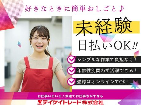 職種/仕事内容 | 仕事内容 ★★くじ引き景品グッズの検品・梱包★★ 人気のお仕事!未経験スタートOK! 大人気キャラクターくじの景品を扱うお仕事♪ (具体的には)  ̄ ̄ ̄ ̄ ̄ ̄ ●検品 →商品を取り出して、 キズや破損がないか目視でチェック♪ あとは箱に戻して完了! の繰り返し! ●梱包 →商品を梱包、出荷先ごとに仕分け など やっていただくのはこれだけ!! 初めての方でも半日あれば覚えられるお仕事! わからないことは先輩staffが 丁寧にサポートするのでご安心下さいね♪ ★☆ スポット・ド短期・単発OK ☆★ ●働き方は自由自在! ●スキマ時間や空いている日を有効活用できる! ●平日だけ、土日だけもOK! ●1日~OKのスポットワーク! ━━━━━━━ ★こんな方に★ ━━━━━━━ ■長期休暇に自由にお金を使いたい! ■週末の飲み会に向けてお金が欲しい ■会話少なめで簡単な仕事が欲しい など ★☆嬉しいメリットを教えてください!☆★ 【1】日払いOK 「急な出費のときに本当に助かる…」 「欲しいものがすぐに買えます♪」 「遊ぶ予定の前にサクッと稼いでます!」 【2】短期OK 「長期休みのときだけ働いてます!」 「次の仕事が決まるまでの"繋ぎ"で」 「季節限定のオシゴトだけ♪」 ★☆ スタッフの声 ☆★ 「家庭と両立して働けています。 子育てが落ち着いたらもう少し シフトを増やしてみようかな!」 「アルバイトをしていたけど 急にシフトに入れなくなって 困っていたときに応募しました!」 みなさん、学校・家庭・他のお仕事など と上手に両立しながら働いていますよ♪ |