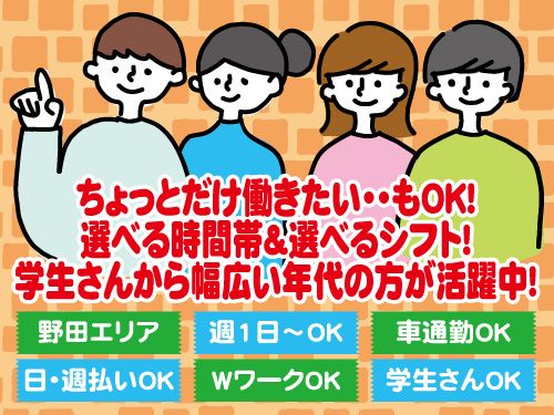 職種/仕事内容 | 仕事内容 学生さん大歓迎! ちょっと働きたい人向け 週1日~希望シフトでOK 学校終わりに・・ 学校が休みの日だけなどOKです。 (お仕事内容) 日用品・ドライ食品の仕分け・梱包 ・スーパー向けの常温の食品(レトルト・ふりかけなど)の 仕分け・袋詰め・袋畳みなどをします。 ・カートを指定の場所に移動させたり かんたんなので、アルバイトデビューさんも安心 学生さんもたくさん活躍してる職場なので すぐ馴染めると思います (オススメポイント) 仕事のひとつひとつが 初めての方でもすぐにできるような 手順になっており、 わかりやすくて、とっても簡単です。 働いてる他の皆さんが優しい人が多くて 教えてくれる人も丁寧おしえてくれるので 質問もしやすくて働きやすい。 自分の学校、都合や、体力に 合わせてお仕事できるのが魅力! 即日勤務OK!すぐ仕事したい人もお気軽にどうぞ! 【どんな人が働いてる?】 進路が決まった学生さんや 進学が決まって、学校がフリー登校になってる人 部活が無い日だけ働く人など色々です! 友達と一緒にシフトINもできちゃう! 部活がない日だけ、学校が終わってからちょっとだけもOK 冬休みに稼ぎたい・・・というのも大歓迎 短時間workなのも魅力の一つです ◆履歴書不要 ◆WEBで簡単登録もOK ◆来店登録もOK |