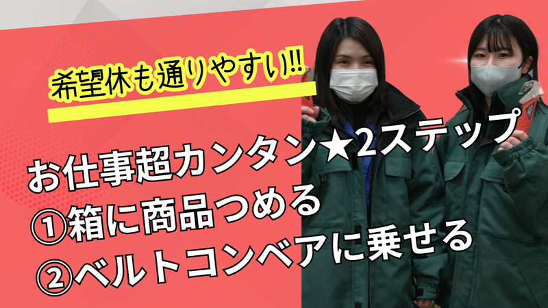 職種/仕事内容 | 仕事内容 ╭━━━━━━━━━━━━━.★*━━╮ \\人気♪冷凍倉庫内の軽作業!// ✅作業はシンプルで簡単✨ ✅初めての方でも安心フォローあり♪ ✅もちろん!防寒着はしっかり貸出◎ ✅週2~OK!幅広い年齢層が活躍中! ✅「寒いのは苦手…」そんな方もご安心を!高機能な防寒着を無償貸出✨ ╰━━.★*━━━━━━━━━━━━━╯ コンビニのアイスや冷凍食品を、お店ごとに仕分けるシンプルワーク! ――――――――――――――――――― ■具体的な作業内容■ ――――――――――――――――――― <作業は下記から選ぶことが可能です★> ✅リストを見て商品を集める ✅箱に詰める ✅ベルトコンベアに乗せる ▼作業はシンプルで分かりやすい内容◎ ……………………………………………… 機械の自動仕分けシステムにより、 難しい作業はありません! システム化されているため 作業がスムーズに進めることができます♪ 箱詰め ↓ フタ閉め ↓ ベルトコンベアに乗せる ・・・以上の簡単作業! その他、冷凍食品の箱出しや 梱包用の箱の組み立ての作業なども お願いします。 ▼20~50代まで幅広い年齢層が活躍中★ ………………………………………………… 未経験の方も安心して始められる環境で、 学生さん、主婦・主夫さん、シニアの方など 幅広い年齢層の方が活躍中の職場です◎ 先輩スタッフが丁寧にお教えするので 安心してお仕事をスタートいただけます。 \\その他こんな魅力も♪// ★あったかい防寒具の貸出があります ★定期的に倉庫から出て休憩とれます◎ ――――――――――――――――――― ■こんな方におすすめ■ ――――――――――――――――――― ✨新大学生や新生活で働きたい方 ✨バイトデビュー大歓迎 ✨土日だけWワークで働きたい方 ✨学生・フリーター・主婦・主夫の方 ✨軽作業・倉庫内作業が未経験の方 |