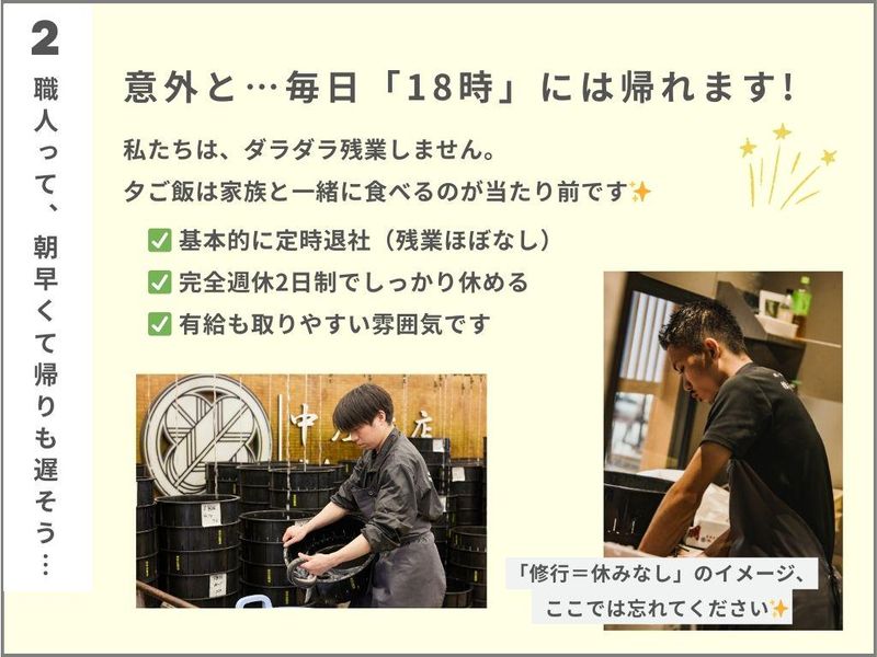 勤務時間 | 固定時間制 勤務時間詳細 実働時間:1日あたり8時間 平均勤務日数:1ヶ月あたり21日 〜 22日 ⏰9:00~18:00 (所定労働時間8時間00分) 残業:7月の繁忙期のみ残業が少し多くなります。 (土用の丑のため) |