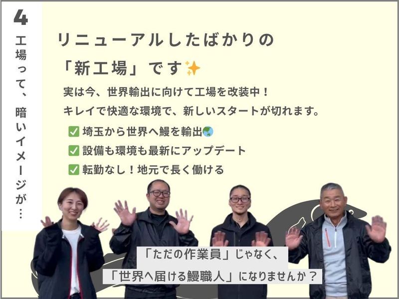 対象となる方 | 求めている人材 \未経験スタート歓迎⭐!/ 学歴不問・経験不問 〈必須条件〉 ・普通自動車運転免許(AT限定可◎) 〈こんな方大歓迎♪〉 ・市場、鰻屋、食品/水産加工業務、建設業など製造業の経験がある方歓迎 ・食品/水産加工(特に鮮魚)に関わったとこがある方 ・正社員として安定して働きたい ・安定、成長している会社で働きたい ・穏やかでアットホームな仲間がそろう職場で働きたい ・ハローワークでお仕事を探している 〈こんな方に向いています✨〉 ・美味しいものが好き!(特にウナギ) ・鮮魚を扱うことに抵抗がない ・魚釣りが趣味 ・魚を捌いた経験がある ・おしゃべりしたり、コミュニケーションをとることが好き 〈こんな業界・職種の方も活躍できます!〉 職人・現場作業スタッフ 製造業(ライン作業)・清掃スタッフ 食品加工スタッフ 飲食店のホール・キッチンスタッフ 店舗販売スタッフ 配送ドライバー・ルートドライバー ■当社について ┈┈┈┈┈┈┈┈┈┈┈┈┈┈┈┈•• 私たち中庄商店は、 天然うなぎ・鮎・マグロ・備長炭など、 “本物”にこだわった高級食材を取り扱う専門卸売です。 \創業90年以上の老舗企業/ 一流の料理人や料亭、ホテル、専門店など 「本当にいいものを届けたい」プロの方々に、 鮮度と品質にこだわった食材をお届けしています。 その中でも“うなぎ事業”は、 当社の中核を担う部門。 今回はその事業部で、 現場作業スタッフを募集します! 「え、うなぎを触るの!?」と驚かれることもありますが、 実は未経験スタートの先輩ばかり! 丁寧な研修と、あたたかいチームワークでお迎えします◎ 〈現場を見守る本部長にインタビュー!〉 ■老舗の技術を、最高の環境で。 埼玉から世界へ、新しい挑戦を。  ̄ ̄ ̄ ̄ ̄ ̄ ̄ ̄ ̄ ̄ ̄ ̄ ̄ ̄ ̄ ̄ 「“職人の仕事”と聞くと、 少し古いイメージがあるかもしれません。 でも今回の工場リニューアルを経て、 私たちはよりモダンで、世界に誇れる組織へ進化します。 今いるメンバーも、これから出会うあなたも、 全員が“世界への発信者”。 新しい環境で、日本の食文化を世界へ届ける。 そんなステージを一緒につくっていきたいんです。」 そう話すのは、現場を統括する本部長。 今回の募集には、 世界進出という挑戦だけでなく、 「もっと働きやすい職場へ進化させたい」 という想いも込められています。 \働き方の“質”もアップデート/ 世界を目指すからといって、 プライベートを犠牲にする必要はありません。 仲間が増えることで、 より柔軟に休みが取れる体制へ。 家族の行事への参加や、 長期休暇の取得も、チームで支え合う文化があります。 『世界レベルの仕事』と『自分の時間』。 その両立を、これからも本気で目指していきます。 (本部長) |