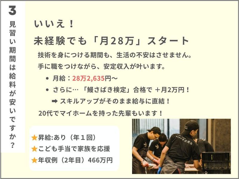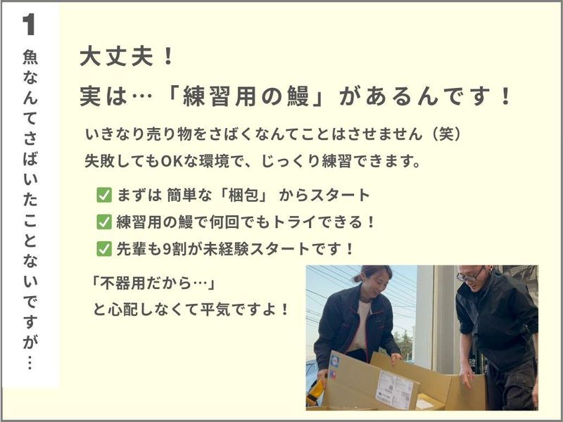 職種/仕事内容 | 仕事内容 \世界へ羽ばたく「中庄の鰻」/ 創業90年以上の老舗でありながら、 今、私たちは大きな挑戦の真っ最中。 埼玉営業所では 海外輸出スタートに伴い、 工場を全面リニューアルしています。 舞台は整いました。 次に必要なのは、 一緒に挑戦してくれる“あなた”です。 ✨中庄商店の魅力ポイント✨ ✅ 未経験から月給28万円以上 ✅ ほぼ毎日18時退社 ✅ 工場リニューアル直後の“成長フェーズ" ✅ 自分の技術が“海外へ”届く ✅ 完全週休二日制(年間のお休みは実質114日) ✅ さばき検定合格でさらに月2万円手当 ✅ 転勤なし/腰を据えて働ける ✅ 創業90年以上の安定企業 ■ 埼玉から、世界へ。 ┈┈┈┈┈┈┈┈┈┈┈┈┈┈┈┈•• あなたが見極め、 あなたが仕上げた鰻が、 海を越えて 世界の食卓へ届きます。 特別派手な仕事ではありません。 でも、 自分の手がけたものが 遠くの誰かの笑顔につながっている。 そんな実感を持てる仕事です。 ■ どんな仕事? ┈┈┈┈┈┈┈┈•• 一言でいうと、 “うなぎを世界へ送り出す仕事”です。 やることは大きく3つ。 ① 出荷準備(仕分け・梱包) ② お客様への電話対応(常連さん中心) ③ ゆくゆくは、うなぎの目利き・さばき いきなり難しいことはやりません。 まずはシンプルな作業から。 ■ 未経験でも本当に大丈夫? ┈┈┈┈┈┈┈┈┈┈┈┈┈┈•• ぜんっぜん、大丈夫です!! 今いる先輩も、 ほぼ全員が未経験スタート。 「魚なんてさばいたことない」 という人ばかりでした。 ■ 育成ステップはこんな感じ ┈┈┈┈┈┈┈┈┈┈┈┈┈┈┈•• 「いきなり職人」なんてことはありません◎ ちゃんと順番に、ゆっくり育てます。 STEP1|入社~1週間 ・袋詰め ・梱包 ・出荷作業 まずはシンプルな作業からスタート。 先輩の隣で一緒にやりながら、 「この仕事ってこういう流れなんだ」と 全体像をつかむところから始めます。 ここでは“完璧”じゃなくてOK。 まずは慣れることが目標です◎ STEP2|1~2ヶ月 ・うなぎのサイズ分け ・状態の見極め 少しずつ“見る力”を育てていきます。 「これ、ちょっと元気ないかも?」 「今日の鰻、ツヤいいですね!」 そんな会話をしながら、 自然と目が養われていきます。 分からないときは、 すぐ横に主任がいます。 STEP3|2ヶ月~ いよいよ、さばきに挑戦っ✨ でも、いきなり本番ではありません。 実は… ちゃんと“練習用”を確保しています。 だから、 「売り物をダメにしちゃったらどうしよう…」 と心配する必要はありません。 失敗して当たり前。 最初はみんな不器用です(笑) 包丁の持ち方から、 鰻の押さえ方、力の入れ方まで。 現場の主任があなたの隣で、 一つずつ丁寧に教えます。 背中を見て覚えろ、なんて言いません◎ STEP4|半年後には… 気づけばあなたも 「さばき職人」として活躍中。 後輩にコツを教える側になっているかもしれません。 ■ 「できるかな…」と不安な方へ ┈┈┈┈┈┈┈┈┈┈┈┈┈┈┈┈•• 実は、 「自信満々です!」って人よりも、 「できるかな…」って慎重な人の方が 上達が早かったりします。 ちゃんと見て、 ちゃんと覚えようとするから。 だから大丈夫。 あなたのペースで、 一緒にプロを目指しましょう。 ■ ちゃんと働けて、ちゃんと休める。 ┈┈┈┈┈┈┈┈┈┈┈┈┈┈┈┈┈•• 「職人=休みない」 そんなイメージ、ありませんか? ここは違います。 ▼ ほぼ毎日、18時退社  ̄ ̄ ̄ ̄ ̄ ̄ ̄ ̄ ̄ ̄ ̄ ̄ 土用の丑の日以外は、 残業ほぼゼロ。 18時には「おつかれさま」。 友達とご飯に行くもよし、 ジムに行くもよし、 ゲーム三昧もよし。 自分の時間、ちゃんとあります。 ▼未経験から月給28万円以上  ̄ ̄ ̄ ̄ ̄ ̄ ̄ ̄ ̄ ̄ ̄ ̄ ̄ ̄ ・賞与年2回 ・昇給年1回 さらに―― 自社「鰻さばき検定」合格で 月2万円手当。 スキルがそのまま収入に直結します。 【年収例】 2~3年目:466万円 4~5年目:535万円 20代でも、 将来設計を考えやすい収入水準です。 ▼ 完全週休二日制  ̄ ̄ ̄ ̄ ̄ ̄ ̄ ̄ ̄ ・年間休日109日+有給5日取得 ➡実質年間114日休み。 長期休暇もあり。 ちゃんとリフレッシュできます。 ▼ 腰を据えて働ける  ̄ ̄ ̄ ̄ ̄ ̄ ̄ ̄ ̄ ̄ ̄ ・転勤なし ・車通勤OK 「せっかく技術つけたのに異動」 なんてことはありません。 ■世界へ挑む 「ちょっとワクワクする老舗」へ ┈┈┈┈┈┈┈┈┈┈┈┈┈┈┈┈•• 創業90年以上の歴史を持つ中庄商店。 でも、私たちは“昔ながら”だけではありません。 いま埼玉営業所では、 海外輸出スタートに向けて 工場を全面リニューアル中。 「老舗」なのに、 ちゃんと進化している会社です。 ✨ リニューアル=チャンスのタイミング  ̄ ̄ ̄ ̄ ̄ ̄ ̄ ̄ ̄ ̄ ̄ ̄ ̄ ̄ ̄ ̄ ̄ ̄ ̄ 世界基準の品質を届けるため、 設備も環境もアップデート。 きれいな工場で、 新しいスタートを切れます。 “出来上がった場所に入る”のではなく、 これから一緒につくっていく感覚。 ちょっと面白くないですか? ✨ あなたの仕事が、海を越える。