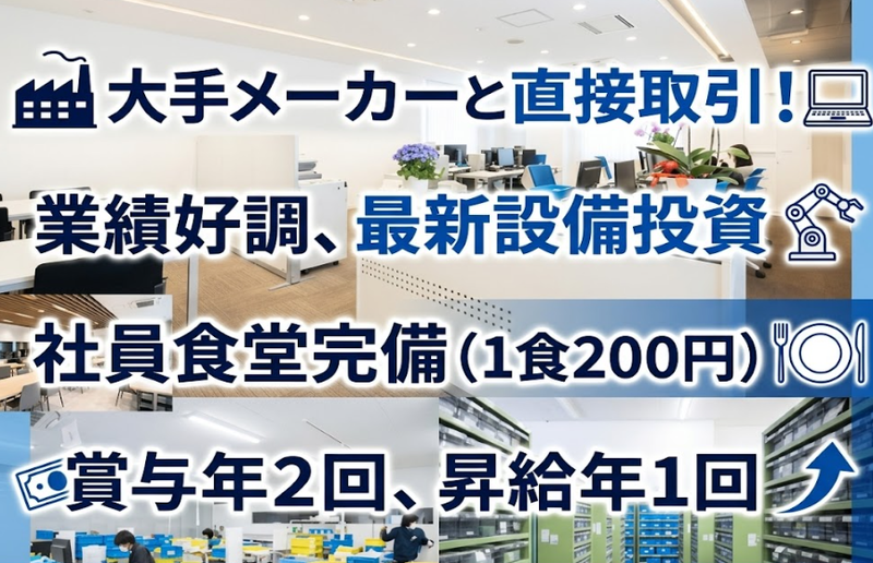 職種/仕事内容 | 仕事内容 ╭━━━✨ ここがポイント! ✨━━━╮ 「残業ゼロ」を本気で目指す会社です。 水曜日はノー残業デー! 年間休日127日でプライベートも充実◎ ╰━━━━━━━━━━━━━━━━━╯ ⭐ 具体的な仕事内容  ̄ ̄V ̄ ̄ ̄ ̄ ̄ ̄ ̄ ̄ ̄ ̄ ̄ ̄ ̄ ̄ ̄ ̄ ̄ 精密機械部品の生産管理業務全般を お任せします。 具体的には… ✅ 見積書の作成業務 ✅ 資材調達および購買計画の立案 ✅ 製品の納期管理・スケジュール調整 ✅ 在庫管理と適切な発注業務 ✅ 協力業者や現場スタッフとのやり取り 生産管理システム「TECHS(テックス)」を 使用し、受発注から納品までを トータルで管理するやりがいのあるお仕事です! ⭐ 1日の流れ(例)  ̄ ̄V ̄ ̄ ̄ ̄ ̄ ̄ ̄ ̄ ̄ ̄ ̄ ̄ ̄ ̄ ̄ ̄ ̄ 08:00 出社・朝礼、メールチェック 09:00 システムで受注状況と在庫の確認 10:30 現場との進捗ミーティング 12:00 お昼休憩(オシャレな食堂あり♪) 13:00 協力業者への資材発注・納期調整 15:00 見積書の作成・データ入力 16:50 退社!お疲れ様でした! ⭐ 安心のフォロー体制  ̄ ̄V ̄ ̄ ̄ ̄ ̄ ̄ ̄ ̄ ̄ ̄ ̄ ̄ ̄ ̄ ̄ ̄ ̄ 入社後3ヶ月間の研修期間をご用意。 業界未経験の方でも、 先輩社員がOJTで丁寧にサポートします。 PCの基本操作(Excel・メール)ができれば、 すぐにシステム操作にも慣れていただけます! ───【当社について】─── 大手半導体メーカーや産業用ロボットメーカーと 直接取引を行っており、業績は絶好調。 最新設備への投資を惜しまず、 自動化・無人化を進めることで、 社員の労働時間削減を実現しています。 |