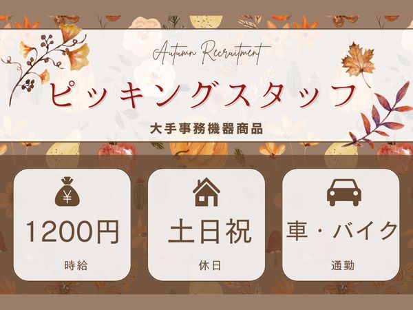 職種/仕事内容 | 仕事内容 【仕事内容】 大手事務機器メーカー商品のピッキング業務をお願いします。 倉庫内で指定された商品を集めるシンプル作業です。 未経験からスタートしたスタッフも多数活躍中! 丁寧な研修があるので安心です。 【アピールポイント】 ======================== ◎完全週休2日制(土日祝休み) ◎髪色・ひげ・ピアス・ネイル自由! ◎車・バイク・自転車通勤OK! ◎未経験からスタート歓迎 ◎大手メーカー商品を扱う安心感 ======================== |