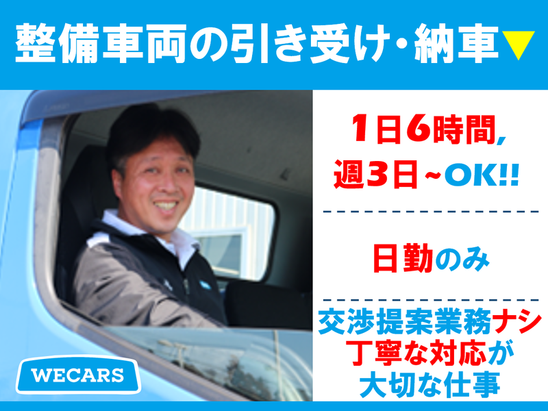 職種/仕事内容 | 仕事内容 整備車両の引き取り・納車をお任せします★ 【この求人のPOINT!】========= 伊藤忠グループ/24年5月設立 ⭐1日6時間&週3日以上勤務大歓迎! ⭐平日メイン&日勤のみのお仕事! ⭐交通費支給!(上限あり) ⭐自動車・自転車通勤OK! ⭐車の知識不要! 今回の募集は お客様(主に法人)の整備車両の 引き取りと納車をメインに 社内メンバーとの連携・報連相を行いながら、 「洗車・車内清掃」「場内の車両移動」 などの軽作業もお任せするお仕事です。 ■運転するのは好きだけど、 夜勤・長距離運転などは不安… ■無理がない範囲で週3日から働きたい… そして安全運転には自信がある!という方 にオススメです◎ ■柔軟な働き方か可能です! 平日がメイン・日中の勤務なので プライベートとも 両立しやすく 働きやすさは抜群です◎ 【具体的なお仕事】=========== ▼お客様(主に法人)の車両の引き取りと納車 └対応エリアは店舗から10km圏内が中心で、 自走での対応がメインとなります。 ▼軽作業サポート └配送の合間に洗車・内装清掃 └場内車両の移動作業 ▼報告業務 └配送数や作業実績を日報フォーマットへ 簡単に記入 ◎各種交渉や営業提案などはありません。 お客様との会話は、法人先へ整備車両の 引き取り・納車に伺った際のご挨拶や 簡単なやり取りが中心です。 ただし、訪問先では企業のお客様と 直接やり取りをするため、 基本的なコミュニケーションを大切にし、 礼儀正しく丁寧な対応ができる方を 歓迎しています。 ✨魅力をピックアップ!✨======= ✅運転業務に集中できるシンプルワーク! └整備業務はなし♪ └車の知識不要で即スタート可能◎ ✅大手企業ならではの安心感★ └約250店舗・従業員4,000名超の安定基盤! └その都度OJTもあるので不安なく働けます ✅自由度の高いシフト環境 └平日メインで10~19時の間で 週3日からの勤務OK └家庭や趣味と両立しやすい環境です♪ ✅配送の空き時間も有効活用! └洗車や場内の車両移動など 働きがいもあります◎ └メリハリのある業務内容です★ ✅体力に優しい運転業務◎ └夜勤・長距離運転はないので体に 無理のない配送業務で長く続けられます ✅安全運転を重視! └経験年数によらず、日々の安全運転への 取り組みと責任感を評価します ✅幅広い年齢層が活躍しています☆ └30代~50代の方をはじめ、幅広い年代が 活躍できる職場です ==================== お客様から預かった車両を扱うため、 責任感と丁寧な取り扱いが求められます。 安全運転を心がけ、日常点検やマナー遵守を 徹底できる方にとって、非常にやりがいの あるお仕事です! 社内は明るい職場で働きやすい環境です! あなたのドライバーとしての経験を ぜひ当社で活かしてみませんか? 【私たちはこんな会社です】======= 『WECARS』 伊藤忠グループ参画の下、 2024年5月に発足した 中古車販売・買取企業です。 現在、全国で約250店舗を展開しています。 スタッフはお客様のカーライフに寄り添い、 最高のサービスのご提供を心がけています。 |