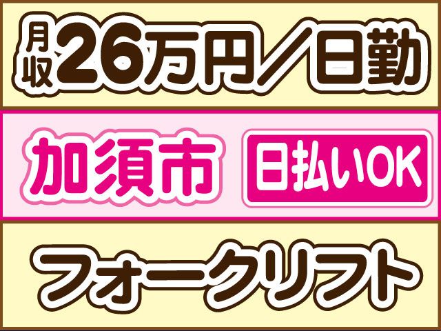 職種/仕事内容 | 仕事内容 月収26万円以上で日勤専門 安心の制服・安全靴など貸与 50代の中高年の方も活躍中 「フォークリフトスタッフのポイント」 〇フォークリフトの資格・経験を活かせる 〇日勤のみ 〇完全週休二日制 〇高時給1550円スタート 〇20代30代40代50代前半の男女活躍中 〇制服、安全靴、ヘルメット、手袋貸与 〇交通費支給(規定内) 〇履歴書不要 〇日払いOK(規定内) 【フォークリフトスタッフの仕事内容】 加須市にある物流倉庫内でのお仕事 ※バターや牛乳を扱っている冷蔵の物流倉庫です 具体的には、 ・フォークリフトを使用した荷受け作業 ・検品 ・梱包 をお願いします。 暖かいダウンジャケットの貸与があり、 冷蔵倉庫のため季節問わず快適にお仕事。 人間関係良好な職場で定着率も抜群です 慣れるまでは先輩がしっかりとサポートしますので安心です。 職場見学(30分~1時間程度)を実施しております。 【勤務について】 〇日勤のみ(9時~18時) 〇完全週休二日のシフト制 急な発熱・体調不良・冠婚葬祭など、 突発的なお休みに柔軟に対応しております。 【こんな経験活かせます!】 下記経験者は前職活かせます。 〇食品製造工場でのパート・アルバイト 〇ピッキング・仕分けパート・アルバイト 〇入出荷・運搬パート・アルバイト 〇梱包・箱詰め・包装パート・アルバイト 〇検査・検品パート・アルバイト 〇倉庫内派遣 〇主婦・主夫パート(職種不問) 〇中高年パート 前職不問で採用しております。 ブランクのある方OK(経験の浅い方もOK) 〇ご不明な点はお気軽にお問い合わせください〇 お電話でのご応募、ご質問も受付中! 株式会社ロフティー白岡支店 スタッフ採用担当まで TEL0800-222-6888(フリーダイヤル) お仕事情報はこちら https://entori.jp/lofty-shiraoka |
