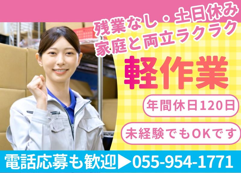 職種/仕事内容 | 仕事内容 日勤固定・残業なし。 仕事とプライベートをきちんと分けて、 毎日同じリズムで働ける シンプル軽作業です。 土日休み+長期休暇ありでオフも充実✨ プライベートや家庭の時間も大切に できる環境で、20代~40代女性が 中心となり活躍中! ブランク復帰も安心の職場ですよ⭐ =================== ⭐ ご応募お待ちしております ⭐ 電話1本で応募完了【055-954-1771】 WEBからは24時間応募受付中です✨ 面接は簡単な内容ですので 緊張せずお気軽にご参加ください♪ =================== ――――――――――――――――――― 【お仕事内容】 自動車部品製造会社で、 梱包や検査をメインにお任せします◎ ✅機械から出てくる 完成品のチューブを取り出して袋詰め ✅サイズや傷などを目視でチェック (検査作業) ✅検品後の製品を箱にまとめ、出荷準備 ✅生産ラインの金型交換など簡単な補助 ✅作業エリアの清掃・整理整頓 ※未経験の方も一から丁寧に教えます。 ※軽量部品なので体への負担は少なめです。 ――――――――――――――――――― 【ここがポイント】 コツコツと集中できる軽作業なので、 黙々と取り組みたい方にピッタリ♥ 残業がなく、家庭やプライベートとの 両立がしやすい環境です! 扱う製品も軽く、清潔な環境で 作業できるため長く続けやすいのも魅力☺ 安定勤務が可能です✨ ――――――――――――――――――― 【こんな方におすすめ】 生活リズムを整えながら、 安定してフルタイムで働きたい方に 選ばれているお仕事です。 久しぶりのお仕事復帰の方も、 工場ワークが初めての方も大丈夫◎ 決まった作業をコツコツ進める内容なので、 無理なく慣れていけます。 「毎日きちんと働いて、 生活を安定させたい」 そんな想いを大切にできる環境です。 ■■■■■■■■■■■■■■ お電話一本かんたん応募! ☎ 055-954-1771 ☎ ぜひお気軽におかけください。 ■■■■■■■■■■■■■■ ――――――――――――――――――― |
