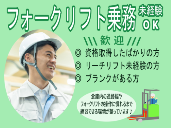 対象となる方 | 応募資格 《必須》 フォークリフト運転技能講習を修了した方 ※乗務経験は不問です! \\\ 業務未経験OK!ブランクOK!/// 倉庫内の通路幅やロケーション、フォークリフト操作に慣れるまで しっかり練習できる環境が整っています! □ カウンターフォークリフトの乗務経験が長い方 □ リーチフォークリフト未経験の方 □ 資格取得したばかりの方 □ 10年以上ブランクがある方 □ 物流センターや倉庫での業務未経験の方 求める人物像 【歓迎】 カウンターフォークリフトを使用しての業務経験がある方 リーチ式フォークリフト乗務経験がある方 ◎乗務経験がない方やブランクがある方もご応募いただけます◎ 【キャリアチェンジをお考えの方を応援します!】 * 資格取得したものの、業務経験・倉庫内作業をしたことがない方 * 中高年にさしかかり、ゆとりあるペースで働きたい方 * 夜勤中心の生活から日勤に切り替えたい方 * 派遣での仕事が初めての方 * 自宅の近くで働きたい方 職場見学~就業開始以降も当社担当者がしっかりサポートします。 学歴 不問 必要な経験等 *【必須】* ・フォークリフト運転技能講習修了証をお持ちの方 *【歓迎】* ・カウンターフォークリフト使用の業務経験のある方 ・資格を活かして働きたいと考えている方 必要な免許・資格 必要な経験欄に記載 |