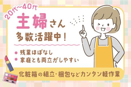 職種/仕事内容 | 仕事内容 <仕事内容> ボディクリームやボディソープ、 着圧ソックスなどお店でで見かける商品の箱詰め! 倉庫型の小売店・ドラックストアに並ぶ 特別セットの軽作業をお任せします。 ステップ1:簡易的な箱を組み立てる ステップ2:バラバラの商品を1つの箱にセット ステップ3:店頭に並ぶ形に組み立て かんたんステップ! <求人のポイント> 綺麗な工場で快適勤務可能! 車通勤OKで通勤ラクラク <勤務時間多数!> 週4日~OKなので家庭との両立などお気軽に相談ください! <取り扱い製品> 「電動ディスペンサー・詰め替え洗剤」 「着圧ソックス」「除毛クリームのセット」 など \女性スタッフが中心に活躍中/ 若手~40代の女性活躍中! ■ 30代主婦(家事と両立) 「子どもが学校に行っている時間に働けるので、 生活リズムを崩さず続けられています。 週4日で家事とのバランスもちょうどよく、 毎日バタバタしないのがありがたいです。」 ■ 40代女性(復職希望) 「久しぶりの仕事復帰だったので体力面が不安でしたが、 軽い商品が中心で助かっています。 作業もすぐに覚えられたし、きれいな工場で快適。 同年代の方も多くて、安心して続けられています!」 ■ 20代女性(もくもく作業好き) 「同じ作業の繰り返しが苦にならないので、 自分に合っていました! 仕事に集中できるし、 身近な商品を見るのも楽しいです♪ コツコツやるのが得意な方にはおすすめです!」 |