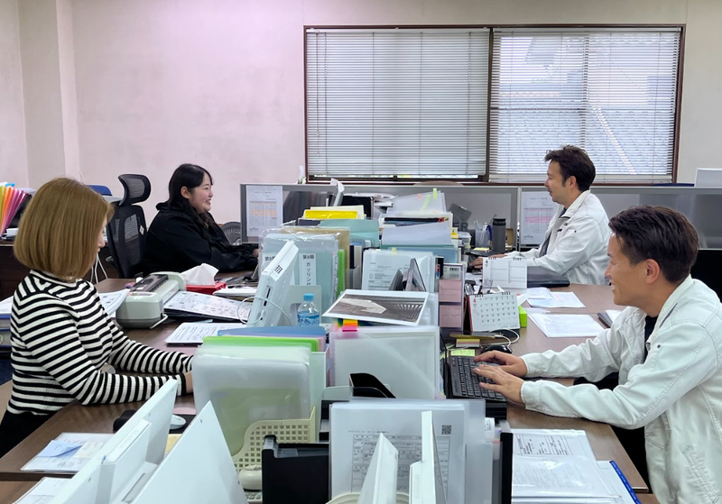 職場環境・雰囲気 | 職場環境 現場へ行っていただき進捗を見ていただいたり、事務所に戻ってきて営業・事務のスタッフと一緒に事務作業をしていただきますが 事務所ではスタッフ全員明るく、楽しい職場です! |