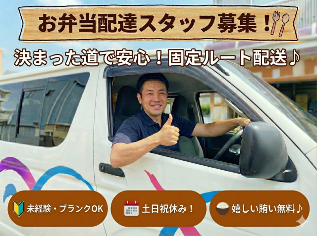 「不在票」を書く手間も、再配達もナシ。お届け先は企業様だけ。自分のペースで回れてストレスフリー。 【未経験でも安心の理由】 最初は先輩スタッフが同乗し、ルートや手順を丁寧に教えます。「運転が好き」「体を動かしたい」という方なら、すぐに活躍できますよ。 アピールポイント ★プライベート重視派に最適 運送業では珍しい「完全週休2日制(土日祝休み)」です。家族との時間や趣味の時間をしっかり確保できます。 ★ 毎日のお昼代が浮く! 美味しいお弁当が「無料」で食べられます。1食500円~800円浮くと考えると、月に1万円~1.5万円分の節約効果も! ★幅広い年代が活躍中 30代・40代の子育て世代から、50代・60代の中高年・シニア層まで在籍中。普通免許 (AT限定可)があれば、経験・年齢・性別は問いません。 ※ハローワークで求職中の方も歓迎です