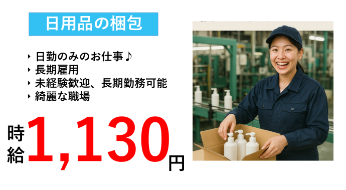 職種/仕事内容 | 仕事内容 \未経験歓迎!日勤専属の軽作業スタッフ募集/ 日用品(シャンプー・リンス)の梱包をして頂きます。 ◎8:30~17:30/平日のみ勤務 ◎空調完備の快適工場 ◎30~50代活躍中 お仕事内容 製造工場で4㎏程度の製品の箱詰めをして頂きます。 ▼主な業務内容 製品の梱包! 伝票の確認! ルーチンワーク♪ |