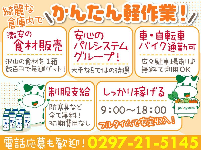 職種/仕事内容 | 仕事内容 ╭━━━━━━━━━━━━━━━━╮ ✨週5日勤務!月収19万円以上も可能!✨ ╰━━━━━━━━━━━━━━━━╯ \電話応募・メール応募どちらも大歓迎/ 気になった方はお気軽にご連絡ください♪ ▶ TEL:0297-21-5145 ◆ 週5日フルタイムで安定した高収入が可能です ◆ 正社員登用制度あり!キャリアチェンジも応援 ◆ 家計に嬉しい社内販売あり (冷凍食品など) ◆ キレイなロッカー・休憩室完備 ◆ 車・バイク・自転車通勤OK ◆ 防寒着・安全靴など必要備品は無料支給 ◆ 安定のパルシステムグループで 長期勤務も安心♪ ⋆・───・⋆・───・⋆・───・⋆ 【仕事内容】 倉庫内での出荷準備をお任せします。 扱うのはパルシステムの冷凍食品が中心。 「組み立てて → 入れる」だけの シンプル作業で、未経験の方も安心♪ モクモク作業・コツコツ作業が 好きな方にもぴったりです◎ ▽主な業務内容 ・商品のピッキング ・セット作業 ・梱包・検品・シール貼り ⋆・───・⋆・───・⋆・───・⋆ ✨働きやすさポイント✨ ✔ 冷凍食品の社内販売あり! スタッフ限定価格で 人気商品をお得に購入OK♬ ✔ 快適な職場環境! 更衣室・ロッカー完備で荷物も安心♪ ✔ 新しく清潔なセンター! 休憩室はカフェテリア風でリラックス◎ |