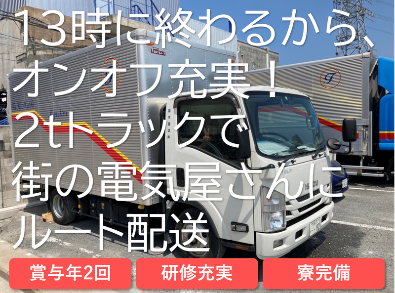 職種/仕事内容 | 仕事内容 冷蔵庫や洗濯機など一般家電製品を納品するドライバーです。 毎日物流センターで積込みを行い、 東大阪近郊の街の電気屋(小規模な家電販売店)さんや 一部の大手家電量販店に配送します。 ※一般家庭にお届けする仕事ではありません。 勤務時間は5:00~13:00ですが、早く配送が終われば帰宅できます。 その場合でも給与は変動しませんのでご安心を。 現在6名の社員と3名の派遣社員が従事していますが、 ほとんどが夕方から副業したり趣味などの時間に充てているようです。 また有給取得率も高くオンオフのメリハリもつけやすい社風です。 全車エアサス、バックアイカメラ、ドライブレコーダー付。 安全運転には細心の注意を払っています! 将来、中距離配送や専属配送への変更も可能です! 【ドライバー未経験者も歓迎】 ボディーサイズも小柄で運転しやすくトラックドライバー入門編に最適です。 平成19年6月1日以前に普通自動車MT免許(8t限定中型と記載)をお持ちの方は乗車可能です。 入社後は座学研修や先輩ドライバーの横乗り研修など手厚く指導するのでご安心ください。 ==================== お電話でのご応募も歓迎しています! TEL/072-988-0951 採用担当 ==================== |