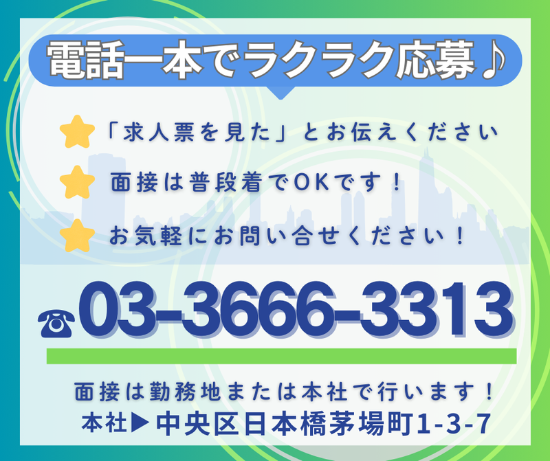 勤務地 | 千代田ビル管財株式会社/「八丁堀駅」徒歩3分 104-0032東京都中央区八丁堀4丁目 |