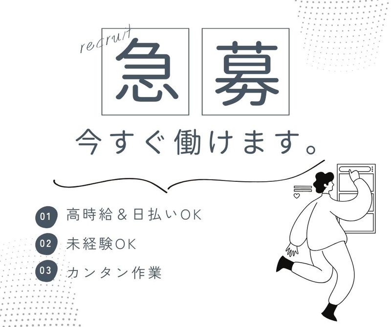 PR・職場情報 ══════════════════════ 求人に関するお問い合わせ・お電話でのご応募は 下記までご連絡ください。 TEL:080-7211-4244(採用担当直通) ══════════════════════ \大手メーカー×オープニング募集/ 検品・梱包などのカンタン軽作業! *:.。オススメpoint 。.:* ・オープニングstaff! ・高時給1150円~! ・週4日~OK! ・即日勤務もOK! ・嬉しい土曜・日曜固定休み! ▼高時給でがっつり稼ぎたい! ▼リフト経験を活かしたい! ▼趣味にお金が必要! ▼生活費の足しにしたい! ⇒キッカケは何でもOK! 株式会社プロテクス:自社雇用 ■優良製造請負事業者認定企業:認定番号 2023002(01) 株式会社プロテクスは厚生労働省が推進する「製造請負優良適正事業者認定制度」 に優良製造請負事業者として認定されています。