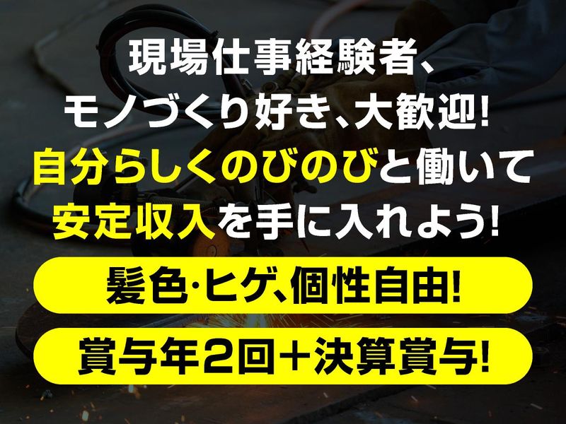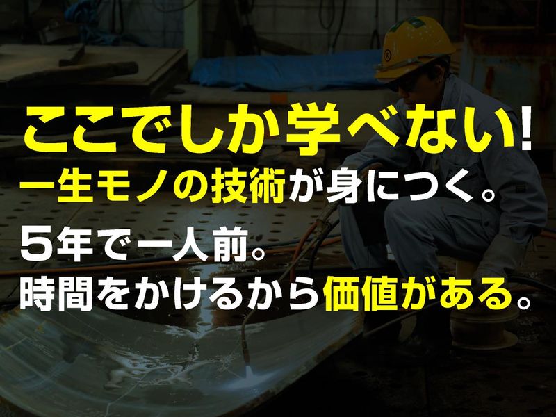 職種/仕事内容 | 仕事内容 ▌昨年、TVでも紹介された技術。 ▌“世界に一つだけ”のモノづくり  ̄ ̄ ̄ ̄ ̄ ̄ ̄ ̄ ̄ ̄ ̄ ̄ ̄ ̄ ̄" 大田造船が手がけるのは、 官公庁向けの 船舶・構造物などの一点物。 同じものを大量につくる 仕事ではありません。 現場では 「この形、どうやって曲げる?」 「ここ、溶接どう入れる?」 と考えながら 図面をカタチにしていきます。 だからこそ、 現場でしか身につかない 技術があります。 ╭━━━━━━━━╮ 参考動画はコチラ ╰━━━v━━━━╯ https://youtu.be/B3I4I_v0JNo?si=r-Qfv40Gfu9m724R ▌具体的な仕事は?  ̄ ̄ ̄ ̄ ̄ ̄ ̄ ̄ ̄ ̄ ̄ ̄ ̄ ̄ ̄" ○鋼材の曲げ加工 ○溶接作業 ○部品の組立 ○船舶・構造物の製造 最初は、 簡単な作業からスタート。 資格を取りながら、 曲げ・溶接へとステップアップします。 +++- ■安定して働ける環境+待遇 -+++ ✅月給25万円〜(未経験月給20万円〜) ✅賞与年2回(3.5ヶ月分)+決算賞与 ✅週休2日制 ✅休憩時間90分 ✅木曜日はNO残業 ✅退職金制度(勤続5年以上) ✅資格取得支援/OJT研修あり ✅車通勤OK ✅職場見学/WEB面接対応 同僚や先輩たちも 気さくな人ばかり。 髪色・ひげも自由ですから みんな個性を生かし のびのび働いています。 +++- ■安定しない毎日を技術で変える仕事 -+++ 例えば・・・ 工業高校で溶接やプレスを学んだ。 現場仕事は好きだけど長続きしない。 ――結局フリーターで先が見えず 収入も安定しない... そんな毎日からリスタートしたい人にこそ この仕事を知ってほしい。 大田造船の仕事は、 官公庁案件が中心。 景気に左右されにくく、 仕事がなくなる心配がありません。 5年で一人前。 簡単ではないけれど、 だから一生使える技術になる。 +++- ■曲げ加工はここでしか学べない -+++ 大田造船の強みは、 大型鋼材の曲げ加工技術。 プレス機を使い、 ミリ単位で形をつくる。 失敗は許されない分、 技術がそのまま評価になります。 現場では先輩が横につき、 手を止めて、教えます。 「見て覚えろ」はありません。 少しずつ、 確実にできることを増やす。 それが、この会社の育て方です。 +++- ■5年かかる。だから価値がある -+++ 一人前の目安は5年。 時間はかかります。 でもそれは、 誰でもできる仕事ではないから。 溶接、曲げ、組立。 現場で身につけた技術は、 年齢を重ねても武器になります。 「今」を抜け出し、 10年先も食べていける仕事を 本気で身につけませんか。 |