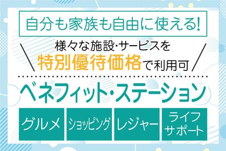 待遇・福利厚生 | 【保険制度】 雇用保険、労災保険、健康保険、厚生年金 【福利厚生】 待遇・福利厚生 【福利厚生】 ・入社祝金5万円(規定) ・社会保険完備 ・交通費全額支給 ・車、バイク通勤OK(ガソリン代補助) ・有給休暇 ・制服貸与 ・食堂あり ・休憩スペースあり(冷蔵庫完備) ・空調完備 ・ロッカーあり ・全面禁煙 ・結婚祝金、出産祝金、扶養こども手当、入学祝金、退職金制度などの福利厚生が充実(規定) ・紹介キャンペーン ※ご紹介くださった方1名につき5万円を進呈(規定) 【ベネフィット・ステーションの利用が可能】 ベネフィット・ステーションとは、 様々なシーンでご利用いただける 総合型福利厚生サービスです。 映画鑑賞やホテルディナー、宿泊施設 などの余暇・レジャー関連をはじめ、 日常で使えるフィットネスや 育児・介護支援、ライフサポートなど 約140万件以上の幅広いメニューを お得な価格で利用できます。 <サービス例> ・全国40,000以上の宿泊施設 ・全国30,000店舗以上の飲食店 ・全国約7,700ヶ所のスポーツクラブ など スタッフさんはもちろん、ご家族の方もお好きなだけ利用できます。 |