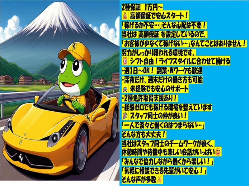 職種/仕事内容 | 仕事内容 運転代行の仕事は、飲酒などの理由で 自動車を運転できなくなった人に代わって、 目的地まで自動車とお客様を安全に 送ることを目的とし、飲酒運転を 根絶するための重要な役割を果たしています。 飲酒運転の厳罰化に伴い、特に郊外や地方で 広く利用されています。 酒癖の悪い酔ったお客様からの依頼は 受け付けていないため、上品なお客様が多く 安心して働けます。 航空会社の元CAから学んだ接客のコツも 伝授するので、経験がない方でも安心して 始められますよ◎ <仕事の流れ> 2人1組で行い、2人で随伴車に乗って 依頼先に向かう ▼ お客様の目的地を確認 ▼ 客車を運転し、目的地に向かう ▼ 目的地に到着後、料金を清算 ▼ 2人で随伴車に乗り、移動 <ここがメリット!> セブ代行では、サポート体制が 充実しており、高収入も目指せます☆ 夜の数時間でしっかり稼げる環境! 週1日から勤務可能で、 自由なシフト&自分のペースで働けます! また高補償と高収入で深夜でも 安定した収入が得られます◎ 20時~翌5時まで▶1万円(最低賃金保障) 運転代行は、自動車免許があれば 就ける仕事のため、限られた時間で効率よく 働きたい方や車の運転が好きな人に最適です。 また土地勘が身につくのは大きな利点です。 客車と随伴車の連携が必要なので、 臨機応変に運転する力も養われます。 運転経験を積むことで、 タクシー運転手としての道も開けますよ! |