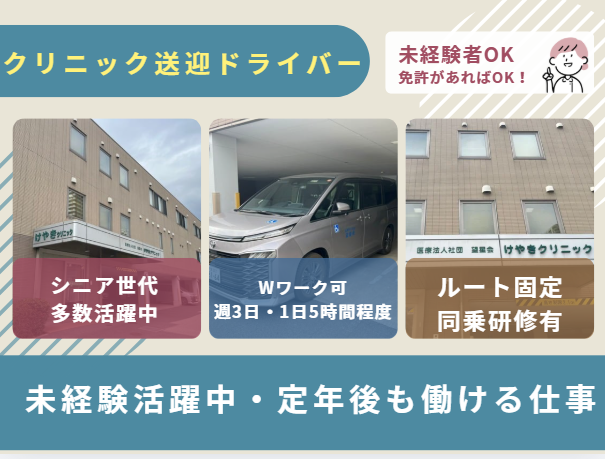 職種/仕事内容 | 仕事内容 ✦・┈┈┈┈┈ ・✦✦・┈┈┈┈┈ ・✦ 定年後も、無理なく続けられるお仕事! 週3日・短時間の安心シフト 運転が好きな60代の方多数活躍中 ✦・┈┈┈┈┈ ・✦✦・┈┈┈┈┈ ・✦ 運転が好き!それだけでOK! 「毎日家にいるのは少し退屈…」 「年金の足しに」 「子育てが落ち着いて時間ができた」 「体を動かしながら、無理なく働きたい」 そんな方に選ばれているお仕事です。 【仕事内容】  ̄ ̄ ̄ ̄ ̄ ̄ ̄ ̄ ̄ ̄ ̄ ̄ ̄ ̄ ̄ ̄ ̄ ̄ クリニックに通院される 患者さんの送迎業務をお任せします。 ✅さいたま市南区・桜区・戸田市周辺の 決まったルート ✅片道10~30分程度 ✅1日3~4往復 ✅8人乗りワンボックスカー(AT車)を使用 ※最初は安心の同乗研修あり。 未経験の方も安心してスタートできます。 <このお仕事のポイント>  ̄ ̄ ̄ ̄ ̄ ̄ ̄ ̄ ̄ ̄ ̄ ̄ ̄ ̄ ̄ ̄ ̄ ̄ ◆60代・定年退職後の方多数活躍中 ◆運転が好きな方歓迎(性別問わず活躍できます) ◆週3日(月・水・金)のみ ◆午前・午後の短時間勤務でスキマ時間を有効活用 ◆決まったルートで安心◎同乗研修あり ◆私服勤務・WワークOK ◆年齢に応じた無理のない働き方ができる◎ <1日の勤務例>  ̄ ̄ ̄ ̄ ̄ ̄ ̄ ̄ ̄ ̄ ̄ ̄ ̄ ̄ ̄ ̄ ̄ ̄ 7:30~10:00(実働2.5時間) ┗患者さんのお迎え 12:30~15:00 (実働2.5時間) ┗診察後の患者さんの送り ※午前・午後の間の休憩時間は自由時間です◎ 中には一度ご自宅に戻られる方も! 拘束時間が少なく、無理なく働ける環境です! スピードや体力を求める仕事ではなく、 “安全に運転できること”が何より大切です。 現在は60代を中心に活躍中。 未経験から始めた方も多く、 同乗研修があるので安心です。 「少し外に出て、誰かの役に立ちたい」 そう思えた方は、ぜひ一度ご応募ください。 まずは話を聞くだけでも大歓迎です。 ご応募お待ちしております! |