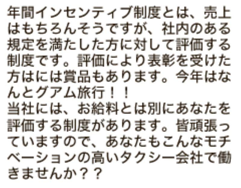 アピールポイント: 入社して4ヶ月で月収100万円も夢じゃない?? 未経験、地理に自信が無くても大丈夫!あなたを稼がせます! 入社後すぐにJPNタクシー乗車可能! 当社のドライバースタッフの前職は様々です。ほとんどの方がタクシー未経験者。 運送などの他業種のドライバー、営業、外資系商社マン、事務員さん、派遣社員、アルバイト、飲食業、自営業まで。 ですから、当社の先輩達は未経験者のあなたの気持ちがとてもよくわかります。 初めてこの業界に入るにあたり、不安もたくさんあるかと思いますが、あなたの気持がわかる、心強い先輩達が待っています。 研修はもちろん、クラブ活動などレクリエーション、シェアハウスを通じて仲良くなる機会もたくさんあります。 そんな仲間と一緒に、日本交通グループの扇橋交通で一緒に働きましょう!! まずは面接だなんて堅く構えずに、 「タクシードライバーってどんな仕事なの?」 「未経験者はどうすれば稼げるタクシードライバーになれるの?」 「歩合制って言うけど給料は安定してるの?」 など、気楽に聞きに来てくださいね!! それから考えても遅くはありません! また、当社は江戸川区のJR総武線「小岩」駅から徒歩7分とアクセス便利です!!
