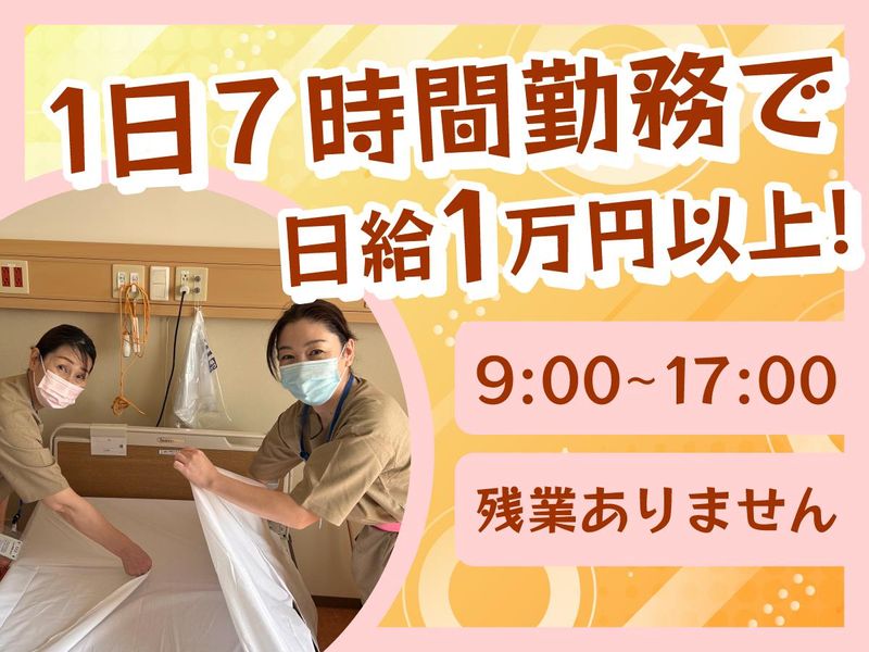 職種/仕事内容 | 仕事内容 \医療業界なら好条件で働けます!/ ⭐日給1万円以上 ⭐1日7時間勤務で残業ナシ ⭐土日祝休み ⭐医療の資格は不問 ⭐日勤専属 ⭐排泄や入浴介助ナシ 「介護の仕事は好きだけど、 人手が足りなくて残業ばっかり… しかも排泄や入浴介助が苦手で。」 「看護師をしていたんだけど、 夜勤が体力的にちょっとキツくなってきた… 土日祝休みで暦通りの休日っていいな。」 弊社では、こんなお悩みのある 介護業界や医療業界の別職種からの 転職者が多数活躍しています! いままで培った経験や知識を活かして 収入も働く条件もアップ♪ さらに働きながら資格取得して スキルアップやステップアップも可能◎ 【 具体的な業務内容 】 病院病棟にて… ◇食事の配膳下膳 ◇病室内の簡単な清掃(ごみ捨てなど) ◇シーツなどのリネン交換 ◇ピンセットやガーゼなど医療で使う物品の補充 ◇メッセンジャー業務(物品や書類を指示された場所へ配送する業務) その他看護師さん・患者様のサポートをお願いします! 軽作業中心で覚えやすいお仕事です♪ 【 1日の流れ(例) 】 9:00~ 飲水量チェック、配水 10:00~ 朝食下膳開始、片付け 11:00~ シーツ交換、環境整備 清拭等(指示があれば) 13:30~ 休憩タイム(60)分 14:30~ 昼食の下膳 15:30~ 患者様を検査室へお連れする 16:00~ 申し送り、備品作成等の調整 ~17:00 残業ナシでお仕事終了♪ その日1日のやることは決まっているので あっという間にお仕事が終わるのも魅力◎ 直接の身体介助はありません! 年齢も性別も気にせず 未経験から働ける看護助手のお仕事♪ 気になった方はお気軽にご応募ください! 働くうえで困ったことや不安なこと 勤務条件についてのご相談は あなた専属のコーディネーターが 何でも相談にのります◎ \スタッフインタビュー!/ ★50代主婦さん 以前はデイサービスで介護の仕事を していました。 夜勤があったり、土日も仕事、 さらに人手が足りなくて残業ばかりで 体力的にきつくなって辞めました。 同じ介護業界で転職を考えていましたが たまたま見つけた看護助手というこの仕事、 まさに私の希望にピッタリの条件でした♪ 排泄や入浴介助がないのも嬉しいし、 働きながら資格取得ができるので 介護系の資格を取って 将来のためにスキルUPしたいです◎ |
