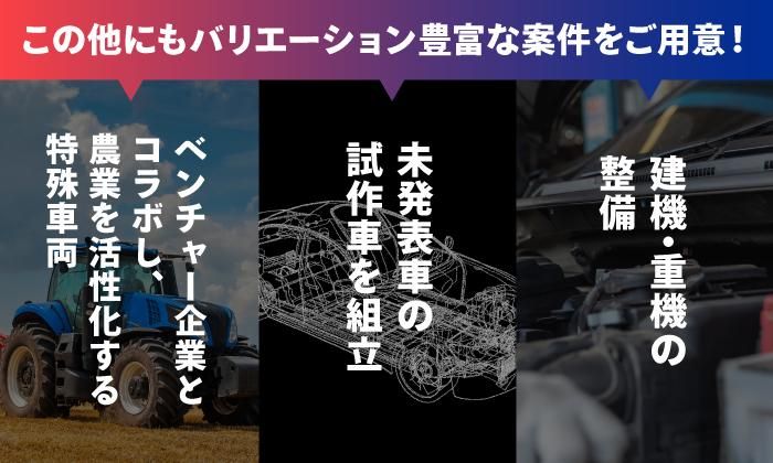 対象となる方 | 求めている人材 ■自動車整備士資格をお持ちの方!ブランク・リベンジOK!実務未経験者の方も歓迎 【こんな資格活かせます】 #大型・小型・二輪自動車整備士 #自動車検査員 #自動車シャシ整備士 #ガソリン自動車整備士 #ジーゼル自動車整備士 #自動車タイヤ整備士 #自動車電機整備士 #自動車車体整備士 ○メーカー資格をお持ちの方(国産技術検定・輸入車テクニシャン・マイスター等) <こんな方は優遇> ○整備士経験のある方(年数不問・ブランク歓迎) ○整備士から他職種にキャリアアップしたい方 |