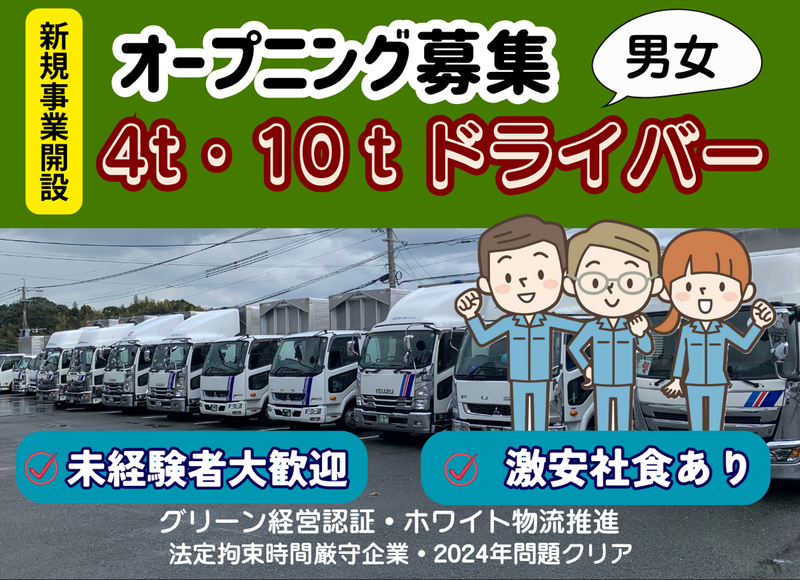 職種/仕事内容 | 仕事内容 物流製品の保管、加工、出荷・輸送まで トータルサポートしている会社です。 ======== お任せするのは ======== 近隣の大手配送会社のセンターや大型商業施設などへの定期便配送。 近距離&日帰りの業務になります。 配送先は大きな敷地を有しているところばかり! 細々したところや慣れない道を走る事もありません。 =============== 2024年問題は既にクリア済み! =============== 2024年4月から施行された 働き方改革により運送業界では、 「時間外労働の上限規制」などが導入され、 多くの会社が対応に追われています。 しかし、当社ではいち早く体制を整え、 法令遵守・安全管理・働きやすさを徹底。 ドライバーの負担を減らしながら、 安定した運行を実現しています! =============== 「グリーン経営認証取得」 「ホワイト物流推進運動参加」 =============== 当社は、働く人の安全や健康を 大切にしながら、環境にもやさしい 物流を目指しています。 <こんな取り組みをしています> 無理のない働き方を実現するために、 勤務時間や休憩時間をしっかり管理。 エコドライブ研修を行い、 運転の安全性と環境への配慮を両立しています。 環境にやさしい車両(低燃費・低排出ガス) を積極的に導入しています。 =============== 未経験&女性スタッフも活躍中! =============== 男女ともに未経験からスタートした方も多数在籍。 丁寧な研修で安心して働けます。 20代~40代が活躍中の明るく楽しい職場。 あなたのご応募をお待ちしております! =============== コスパ最強の社食あり! =============== 弊社では常備型社食サービスを 導入しており、100円から様々な メニューを準備しています。 スタッフにも大好評なんですよ ================= \ 新規採用 働き方改革応援企画 / ================= ・しっかり稼ぎたい ・プライベートを大切にしたい 当社では色々な配送コースを用意 出来ますので、希望の働きかたを 相談できる環境です。 ================= \ 安全運転のための装備も万全 / ================= 全車にバックモニターや ドライブレコーダー、 デジタコを搭載しています。 そのため、 ちょっと面倒な日報もありません! 働きやすさと社会貢献を両立する当社で、 新しい一歩を踏み出してみませんか? |