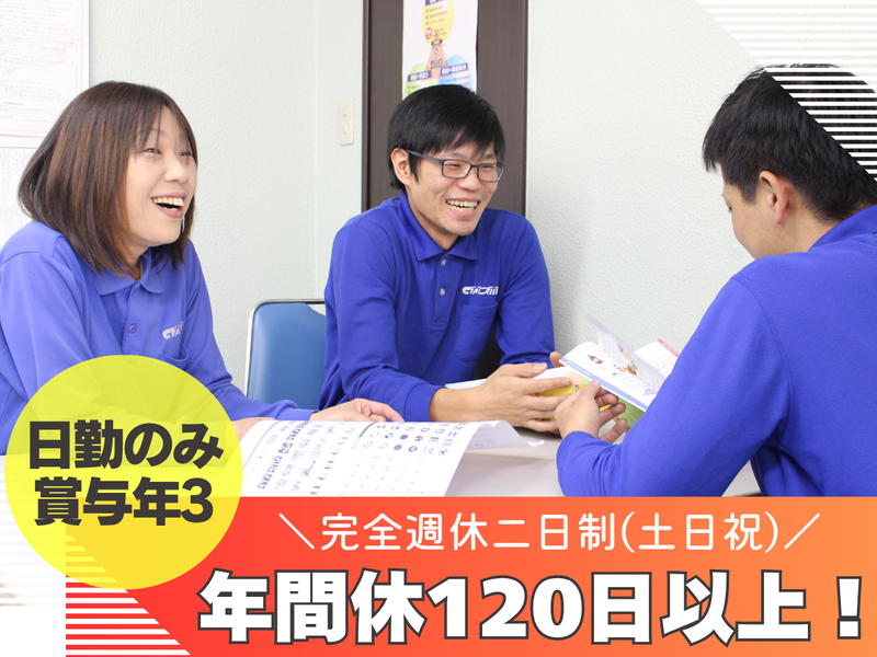 休日休暇 | 休日休暇 土日祝休み(完全週休二日制) ※希望により休日勤務可 有給・夏季・年始・慶弔・特別休暇あり *年間休日120日以上 ※その他、参観日・運動会等お子様の行事や家族旅行等、希望日相談に応じます。 ★有給休暇支援金制度あり ※当社は健康経営優良法人認定企業です!スタッフ全員が働きやすい環境を整備しております。 |