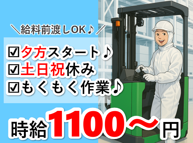 職種/仕事内容 | 仕事内容 【フォークリフト作業員】 ◎食品工場の物流現場にて 下記業務を行っていただきます! ・入出庫のフォークリフト作業 ・段ボールの運搬作業 ※基本的にフォークリフトは リーチフォークリフトの 作業になります。 ※クリーンスーツでの 作業になります! 〇食品工場の物流現場において 資格を活かせる フォークリフト作業員の募集です! 〇リーチフォークリフトを使用した 製品の入出庫作業を行います! パレットに手作業にて段ボールを 運んでフォークリフトにて 冷蔵倉庫に運ぶ単純作業です! ※段ボールは1つ5キロ程度 〇夕方スタートのお仕事になります! 22時以降は深夜手当で 効率よく稼げる♪ 通勤も混まない時間もおすすめ! 〇丁寧な研修あり! フォークリフトの免許を持っていて 実務経験がない方でも問題ナシ! 先輩社員の丁寧な研修が あるので安心♪ / ・作業服貸与! ・様々な年代の方が活躍中! \ ■■■ここもチェック!■■■ ◇有資格者活躍中 ◇フリーター活躍中 ◇ブランクOK ◇長期 ◇残業月20時間以下 ◇友達と応募OK ◇家庭都合休OK ◇40代以上応募可 ◇50代以上応募可 ◇60代以上応募可 ◇学歴不問 ■■■■■■■■■■■■■■ |
