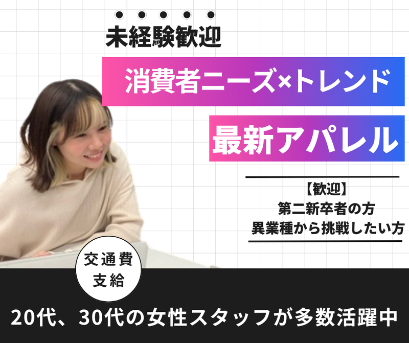 対象となる方 | 求めている人材 20代、30代の女性スタッフが多数活躍中です! 【優遇】 ・アパレル業界での生産管理や営業事務に携わった経験をお持ちの方 ・計画通りに商品が、出荷できるために関係各所に折衝する経験をお持ちの方 【歓迎】 ・第二新卒者の方 ・異業種から挑戦したい方 ・アパレル業界に興味が有る方 ・人と会話をするのが好きな方 【こんなみなさんへ】 ・商品知識はもちろん、業務に基本から全てお教えしますのでご安心下さい。 ・自分のディレクション能力で全国各地に商品を流通させる楽しみややりがいを実感してみてください。 ※性別を問わず活躍できる環境が整っています。 |