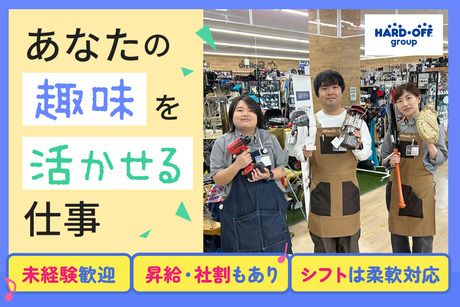 仕事内容 工具専門店「ハードオフ工具館」 ✅DIYが好き、工具や専門用具が好き、 物をつくることが好き、好きなことや趣味が活かせます! ✅専門知識がなくてもマニュアル完備だから安心! 買取査定や販売に興味がある方に◎ 【おすすめポイント】 ・10月より時給UP!MAX時給1,280円! 昇給も頑張りに応じて反映します! ・未経験OK!95%以上が未経験スタートです! ・週3日〜OK!シフト調整も柔軟に対応できます! 未経験でも経験者でも◎、趣味の延長◎ 働きたい姿を実現できる環境がハードオフにはあります! ①商品の陳列 ②買取査定 ③工具の点検や調整 できることを増やしていきましょう! 頑張りに応じて昇給する制度もありますよ! 採用基準は「明るく元気にお客様へ対応できる方」これだけです! 人柄重視の採用なので経験やスキルがなくてもOK! 工具関係のスキル・資格がある方は即活躍できますよ♪ 接客未経験の方も安心してください! こちらからお客様に積極的にお声がけするよりも、 困っている方のお手伝い…そんなスタンスでOKです! Wワークやシニアさんも応援! ブランクのある方も大歓迎です! 未経験から始めたスタッフも多数活躍中! 不安なことがあればいつでも相談して下さい♪ 分からないことがあればしっかり教えるので、いつでも質問して下さい!